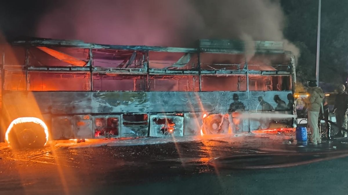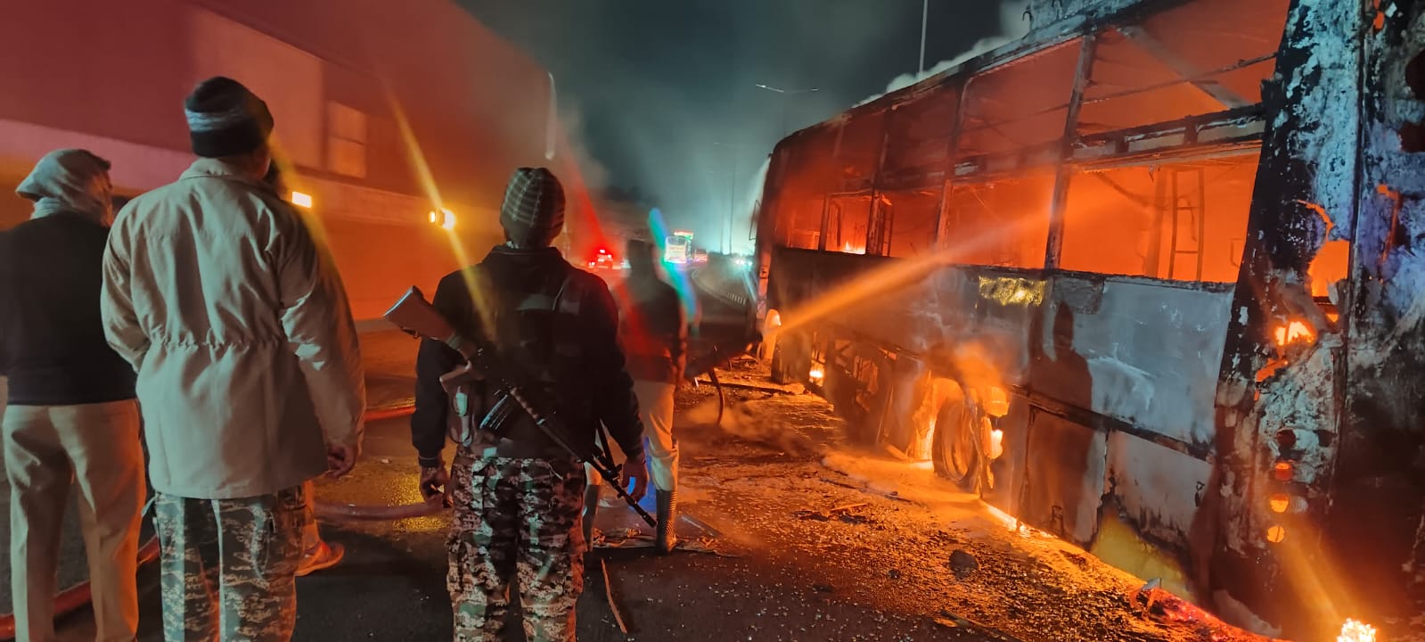 (बस में लगी आग को बुझाते अग्निशमन कर्मी। फोटो जागरण) |