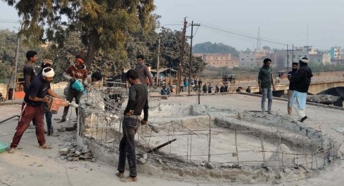 मजार के मलबे के बीच लोहे व छड़ को काट कर अलग करते मजदूर। जागरण