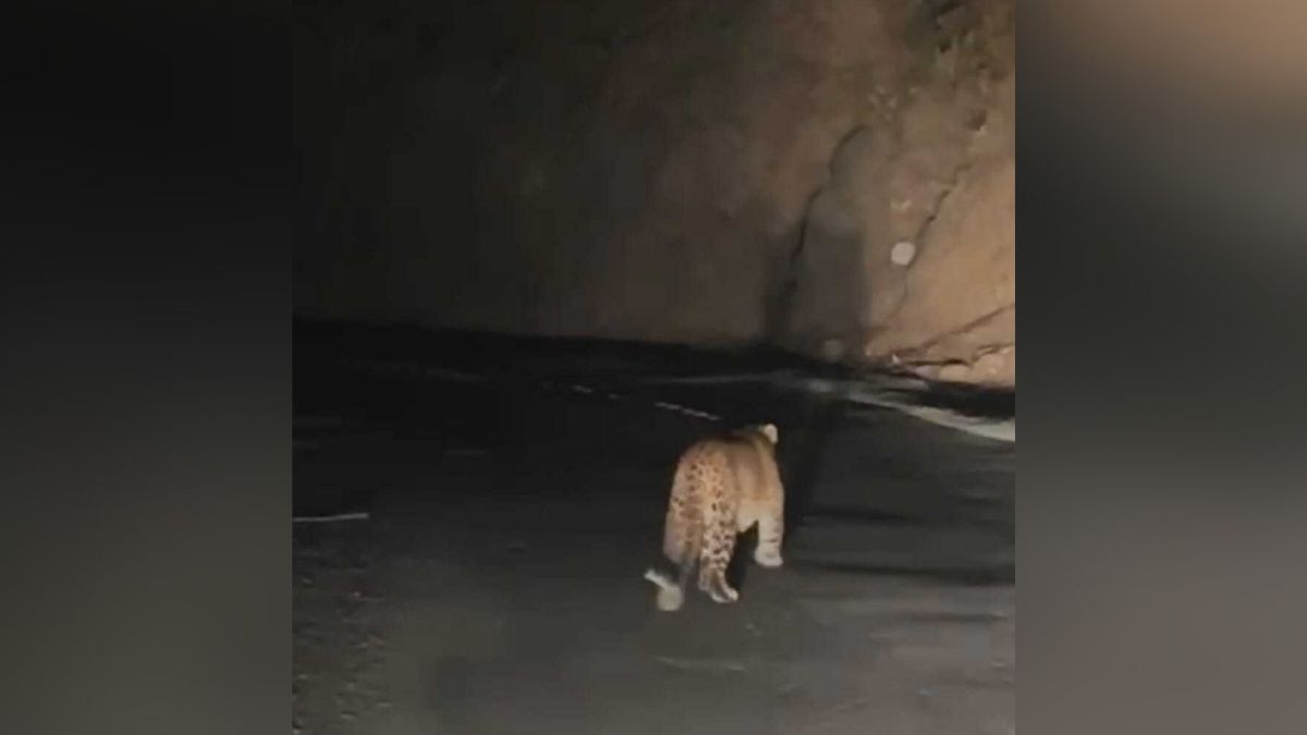 छिबरो पावर हाउस के पास मंगलवार देर शाम सड़क पर चहलकदमी करता दिखा गुलदार। ग्रामीण