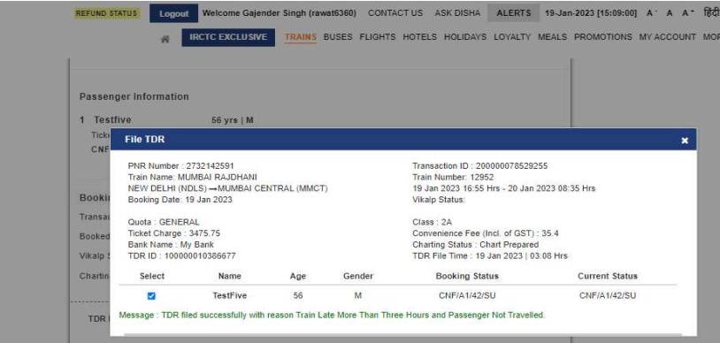 पूरा रिफंड पाने के लिए, ट्रेन के असल डिपार्चर से पहले ऑनलाइन TDR फाइल किया गया हो।