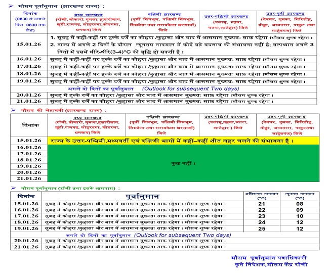 मकर संक्रांति के बाद ठंड से राहत की उम्मीदों पर मौसम विभाग ने विराम लगा दिया है। मौसम केंद्र रांची से जारी अगले पखवाड़े के पूर्वानुमान में तापमान में भारी गिरावट का अनुमान जताया गया है।