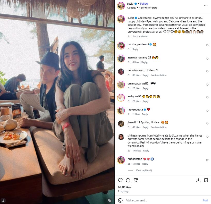 इससे पहले सुजैन खान ने ऋतिक रोशन को उनके 52वें जन्मदिन (10 जनवरी 2026) पर बधाई देते हुए एक दिल छू लेने वाला पोस्ट साझा किया था। उन्होंने लिखा, “आप हम सबके लिए हमेशा आसमान के चमकते सितारे की तरह रहेंगे। जन्मदिन मुबारक हो रे ... तुम्हें और सबा को ढेर सारा प्यार। आपकी जिंदगी खुशियों से भरी रहे। हमारा परिवार हर बुरी नजर से बचा रहे और हमेशा इसी तरह जुड़ा रहे। हम सब बहुत भाग्यशाली हैं कि यूनिवर्स हमें प्रोटेक्ट कर रहा है।“