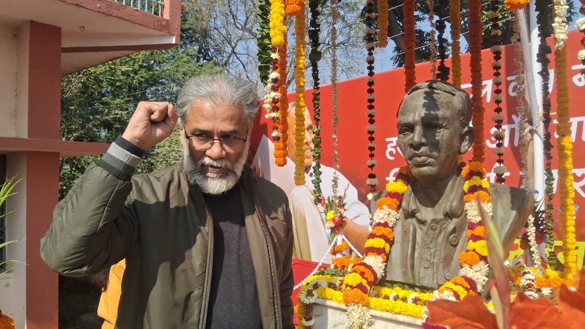 शहीद महेन्द्र सिंह की प्रतिमा के सामने सलामी देते भाकपा माले महासचिव दीपंकर भट्टाचार्य।