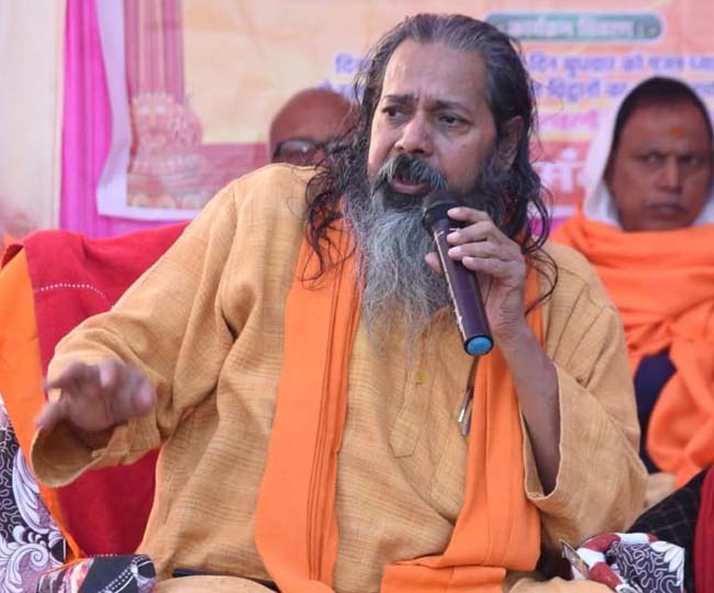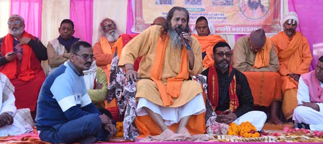 मंदार महोत्सव में कामधेनु मंदिर में भगवान मधुसूदन भगवान के बारे में बातते स्वामी आगमानंद।