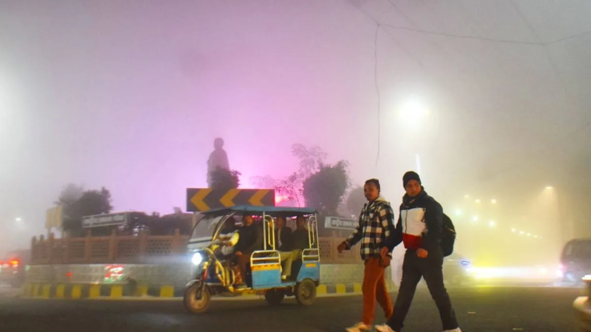 कंपकंपाती रात और घने कोहरे की चादर के बीच राष्ट्रीय एकता चौक से गुजरते राहगीर। लवलीन यादव।