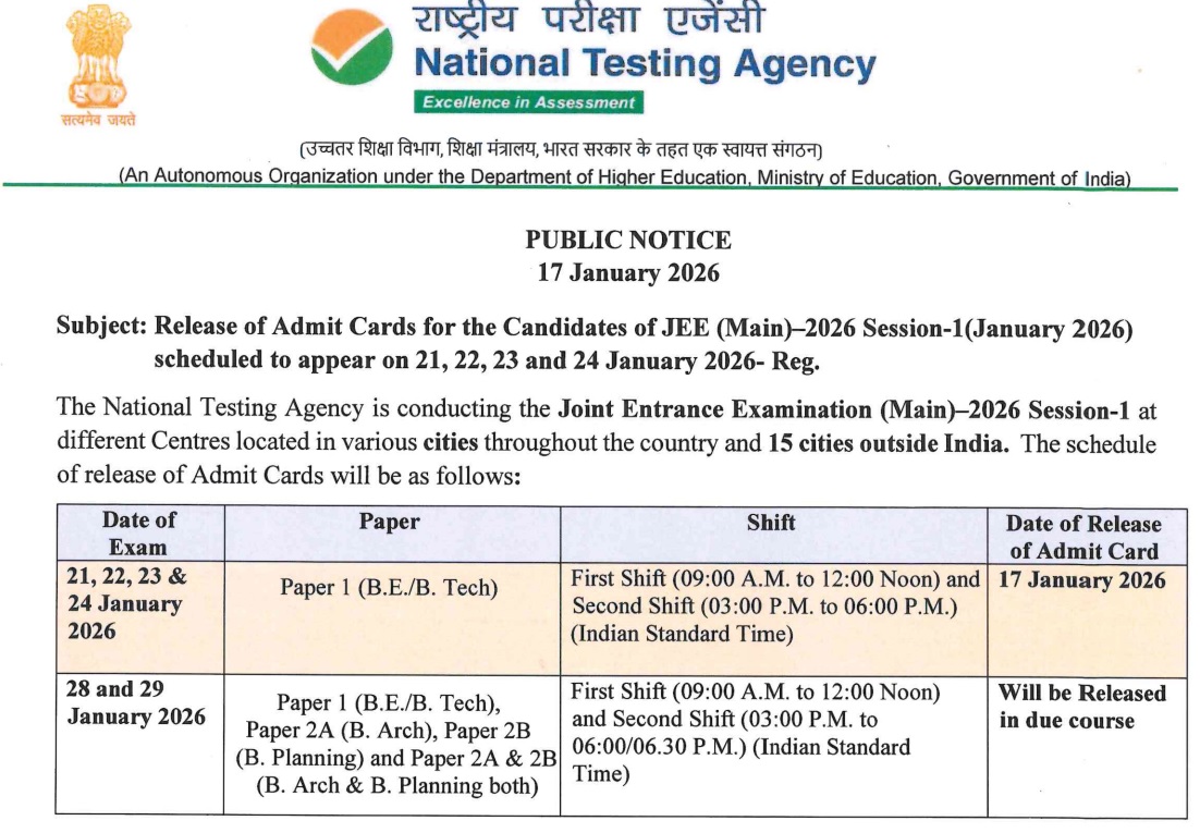 एजुकेशन डेस्क, नई दिल्ली। नेशनल टेस्टिंग एंजेंसी (NTA) की ओर से 21, 22, 23 एवं 24 जनवरी 2026 को होने वाले ज्वाइंट एंट्रेंस एग्जामिनेशन (JEE) मेन सेशन 1 के लिए एडमिट कार्ड जारी कर दिए हैं। जिन छात्रों ने इस परीक्षा के लिए आवेदन किया था वे तुरंत ही एनटीए की ऑफिशियल वेबसाइट पर जाकर JEE Main Hall Ticket 2026 डाउनलोड कर सकते हैं। अन्य डेट्स की परीक्षा के लिए छात्रों के एडमिट कार्ड जल्द ही जारी किये जायेंगे।