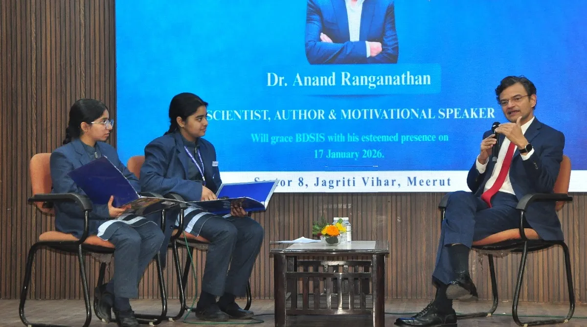बीडीएस इंटरनेशनल स्कूल में विकसित भारत की राह पर मोटिवेशनल कार्यशाला मे पैनल डिस्केशन करते  मुख्य अतिथि डॉक्टर आनंद रंगनाथन। जागरण