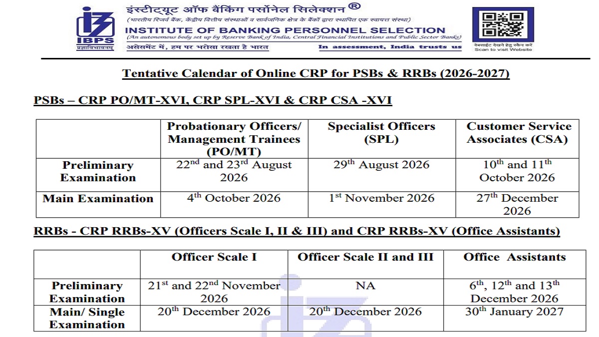 एजुकेशन डेस्क, नई दिल्ली। इंस्टीट्यूट ऑफ बैंकिंग पर्सोनेल सेलेक्शन (IBPS) की ओर से प्रतिवर्ष पीओ/ एसओ/ क्लर्क/ ऑफिसर/ ऑफिस असिस्टेंट/ कस्टमर सर्विस एसोसिएट (CSA) आदि पदों को भरने के लिए भर्तियां निकाली जाती हैं। जो भी अभ्यर्थी आईबीपीएस की इन भर्तियों की तैयारी में लगे हैं उनके लिए वर्ष 2026-27 में होने वाले एग्जाम के लिए कैलेंडर जारी कर डेट्स की घोषणा कर दी गई है। अभ्यर्थी निर्धारित तिथियों को ध्यान में रखकर अपनी भर्ती तैयारियों को तेज कर सकते हैं।
