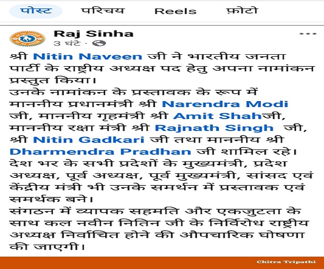 नितिन नबीन का एकल नामांकन होने की जानकारी पार्टी के राष्ट्रीय रिटर्निंग पदाधिकारी के. लक्ष्मण ने सोमवार को दी। उनके बयान को झारखंड भाजपा के नेता इंटरनेट मीडिया पर जारी कर हे हैं। जिसमें कहा गया है-भाजपा के राष्ट्रीय अध्यक्ष पद के लिए केवल नितिन नबीन का ही नामांकन प्रस्तावित किया गया है।