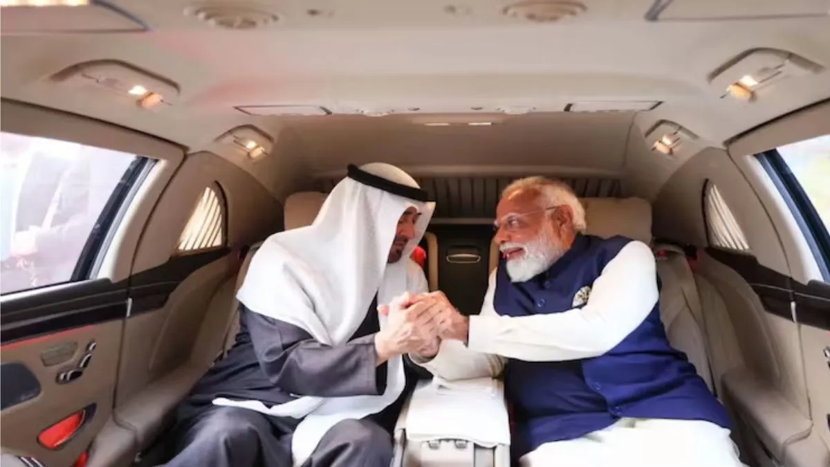 पीएम मोदी ने शेख मोहम्मद के साथ तस्वीरें भी पोस्ट कीं, जिसमें एक तस्वीर ऐसी है, जिसमें दोनों नेता कार में बैठे हुए हैं और एक अन्य तस्वीर में दोनों नेता एक-दूसरे के गले मिल रहे हैं।