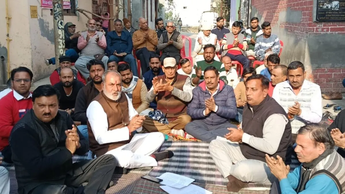 मुजफ्फरनगर के मोहल्ला गऊशाला पश्चिमी में मुस्लिमों द्वारा मकान खरीदे जाने के विरोध में घर के बाहर बैठ हनुमान चालीसा का पाठ करते स्थानीय लोग एवं हिंदू संगठन के पदाधिकारी
