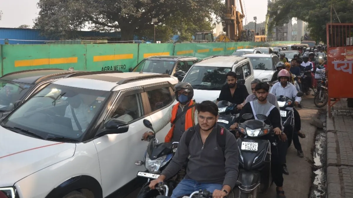 Agra Metro के निर्माण कार्य के चलते ट्रैफिक जाम में फंसे लोग।