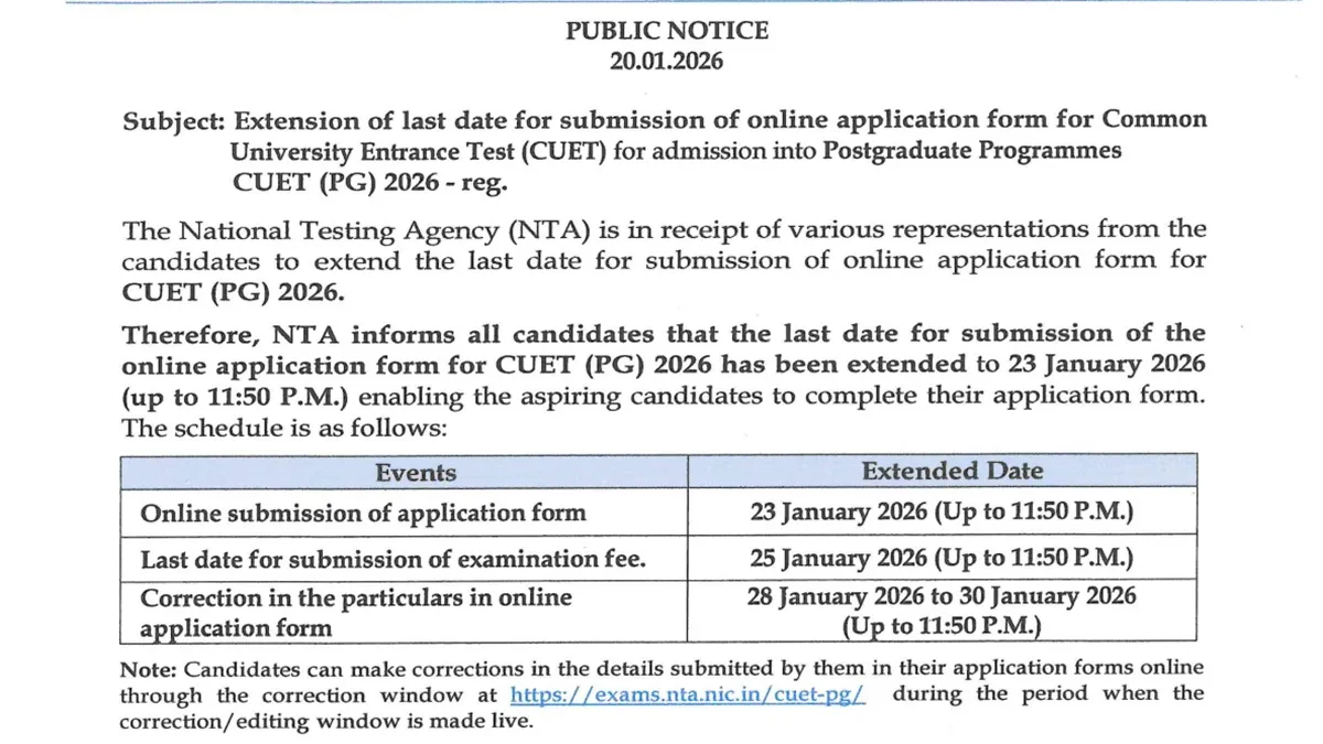 एनटीए की नई आधिकारिक अधिसूचना के मुताबिक उम्मीदवार 23 जनवरी रात 11.50 तक आवेदन कर सकते हैं। इसके अलावा, फीस जमा करने की अंतिम तिथि 25 जनवरी, 2026 निर्धारित की गई थी। साथ ही उम्मीदवारों को 28 जनवरी से लेकर 30 जनवरी तक फीस जमा करने का मौका दिया जाएगा।