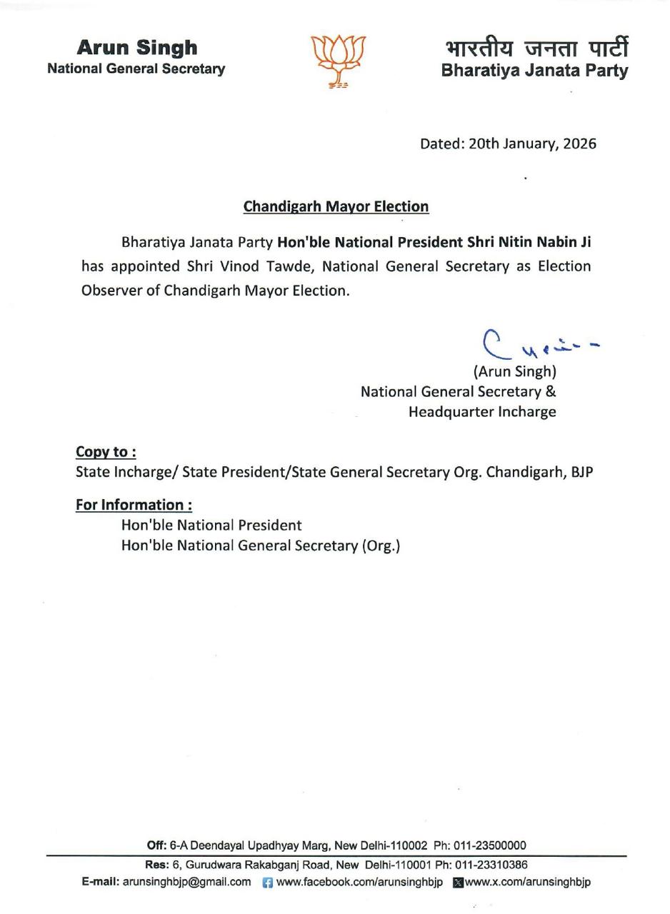 इसके अलावा, पूर्व बीजेपी महासचिव राम माधव को ग्रेटर बेंगलुरु नगर निगम चुनावों के लिए प्रभारी बनाया गया है, उनके साथ राजस्थान के पूर्व प्रदेश अध्यक्ष सतीश पूनिया और महाराष्ट्र के विधायक संजय उपाध्याय को सह-प्रभारी नियुक्त किया है। बीजेपी की ओर से विनोद तावड़े को चंडीगढ़ के नए मेयर के चुनाव की देखरेख के लिए का भी प्रभार दिया गया है। |