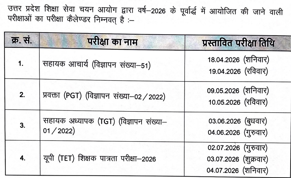 | परीक्षा का नाम | एग्जाम डेट | | सहायक आचार्य (विज्ञापन संख्या-51) | 18 और 19 अप्रैल 2026 | | प्रवक्ता (PGT) (विज्ञापन संख्या-02/2022) | 9 एवं 10 मई 2026 | | सहायक अध्यापक (TGT) (विज्ञापन संख्या- 01/2022) | 3 एवं 4 जून 2026 | | यूपी शिक्षक पात्रता परीक्षा (UP TET) 2026 | 2, 3 एवं 4 जुलाई 2026 |