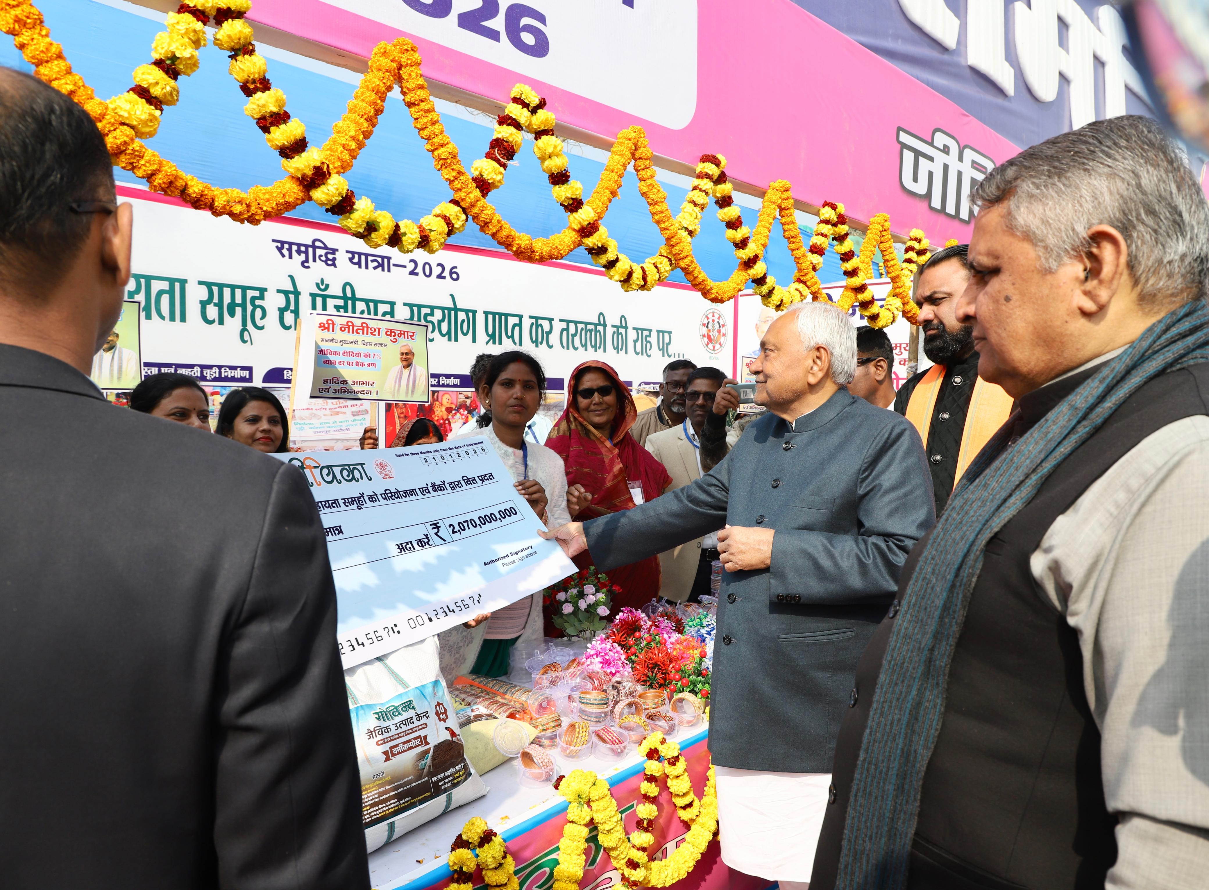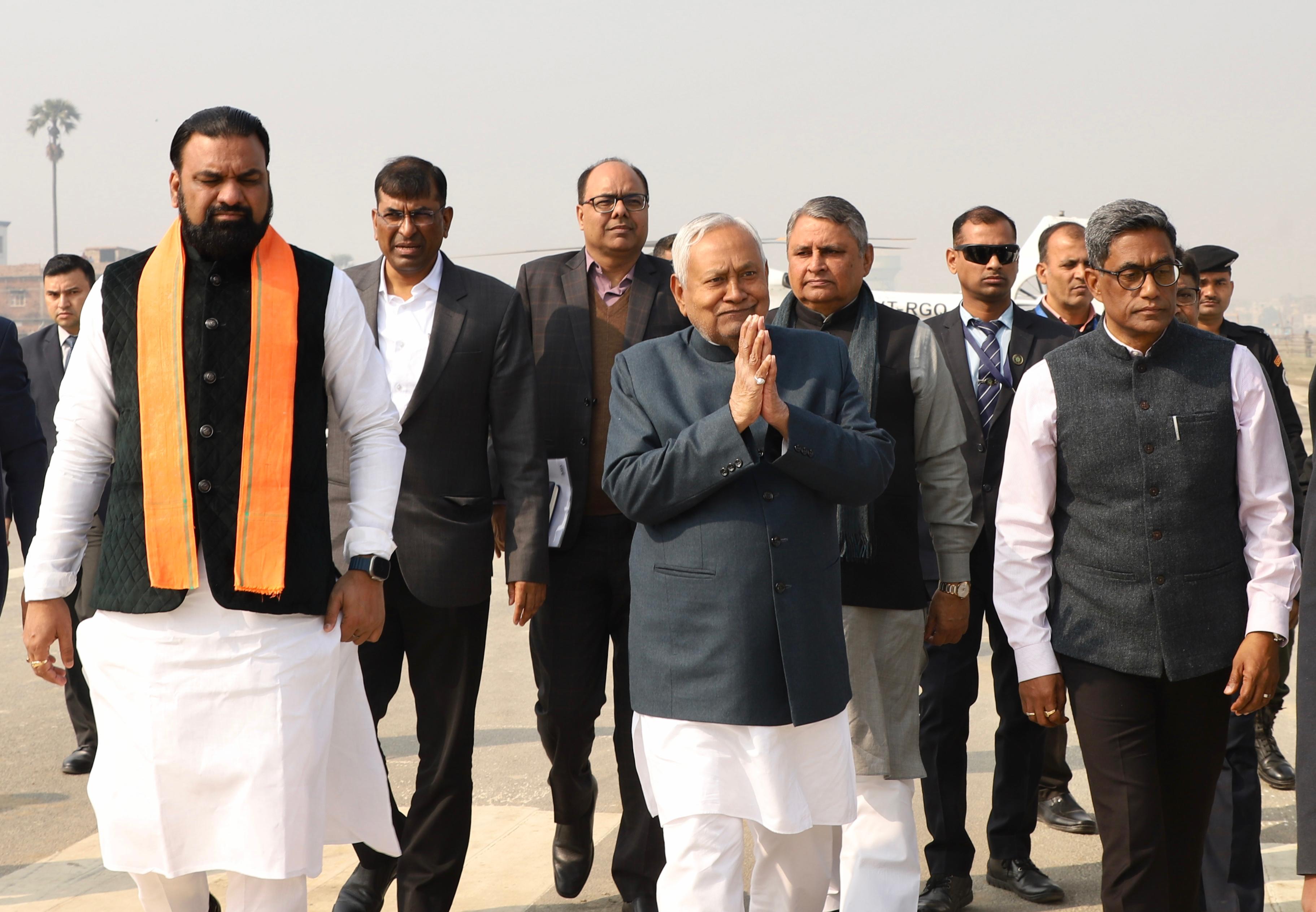 अमृतेश, छपरा। बिहार के मुख्यमंत्री नीतीश कुमार समृद्धि यात्रा के दौरान बुधवार को छपरा पहुंचे। जहां सदर प्रखंड परिसर में विकास की एक जीवंत झलक देखने को मिली। हेलीकॉप्टर से सुबह 10:56 बजे छपरा हवाई अड्डा पर उतरने के बाद मुख्यमंत्री सड़क मार्ग से सदर प्रखंड पहुंचे। उनके साथ उपमुख्यमंत्री सम्राट चौधरी भी मौजूद थे। पूरे कार्यक्रम के दौरान विकास, रोजगार और महिला सशक्तिकरण की झलक हर कदम पर दिखाई दी।