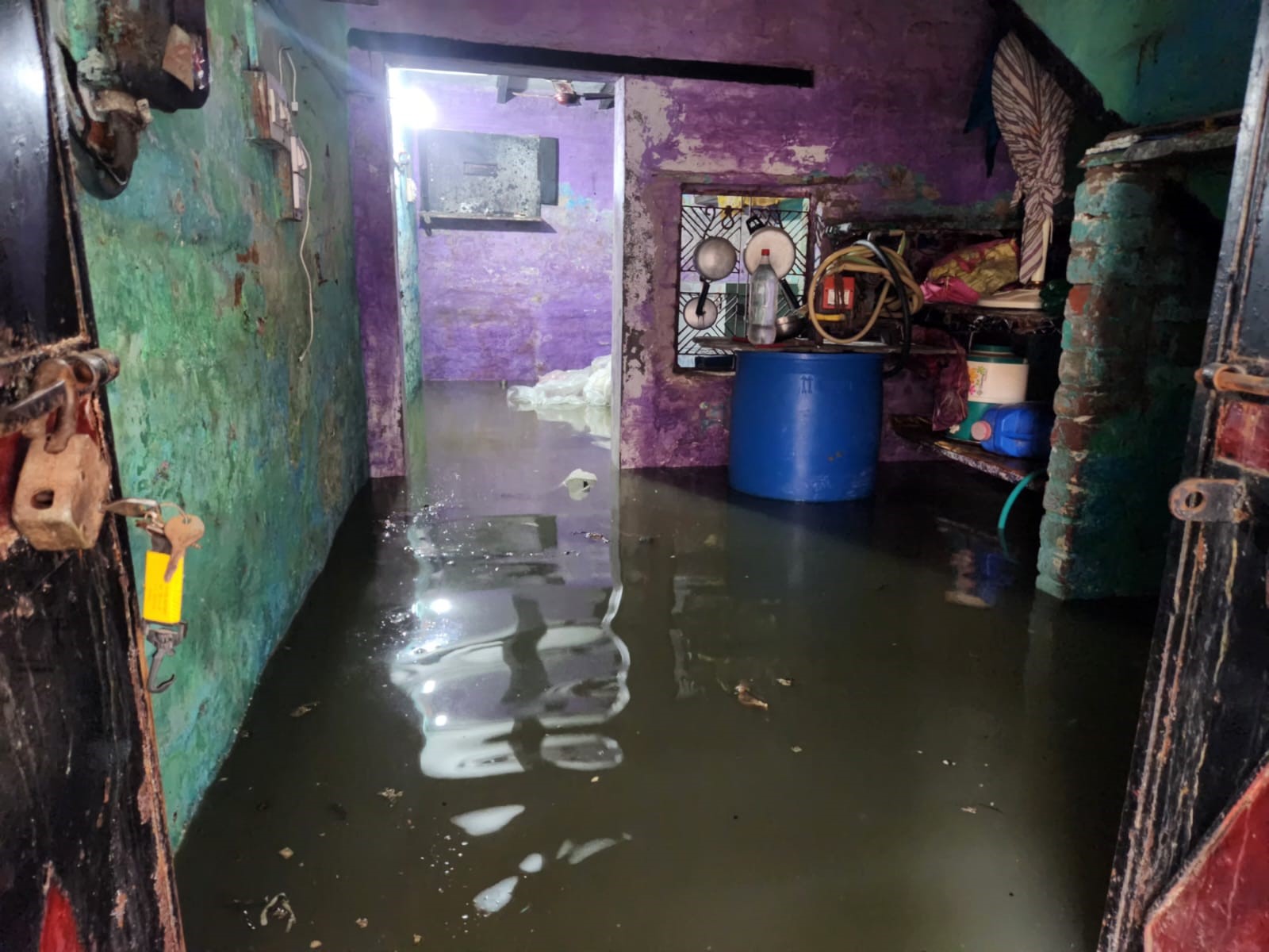 किराड़ी क्षेत्र की शर्मा कॉलोनी में मकान में जमा दो फीट पानी। जागरण