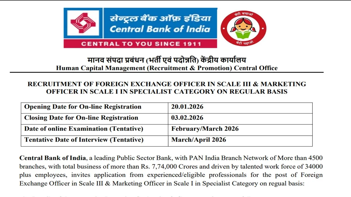 जॉब डेस्क, नई दिल्ली। सेंट्रल बैंक ऑफ इंडिया (CBI) की ओर से स्पेशलिस्ट ऑफिसर के पदों पर भर्ती के लिए ऑफिशियल नोटिफिकेशन जारी कर दिया गया है। जो उम्मीदवार बतौर सीबीआई के पदों पर नौकरी करना चाहते हैं। उनके लिए यह एक सुनहरा मौका है। इन पदों पर आवेदन करने के लिए ऑनलाइन आवेदन प्रक्रिया 20 जनवरी से शुरू हो गई है। इसके साथ ही स्पेशलिस्ट ऑफिसर के पदों पर आवेदन करने की अंतिम तिथि 03 फरवरी, 2026 निर्धारित की गई है।