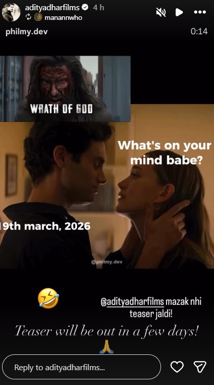 शुक्रवार की सुबह \“धुरंधर\“ के डायरेक्टर आदित्य धर ने एक फैन की पोस्ट पर रिएक्ट किया, जिसने उनसे धुरंधर 2 का टीजर जल्द से जल्द रिलीज करने को कहा था। फैन ने लिखा, \“@Adityadharfilms मजाक नहीं, टीजर जल्दी\“। इस पर आदित्य धर ने हंसने वाली इमोजी के साथ रिएक्ट किया और धुरंधर 2 के टीजर के बारे में अपडेट देते हुए लिखा, \“टीजर कुछ दिनों में आ जाएगा\“। हालांकि उन्होंने कोई तारीख नहीं बताई, लेकिन ऐसा अंदाजा लगाया जा रहा है कि टीजर 26 जनवरी को गणतंत्र दिवस के मौके पर रिलीज हो सकता है।