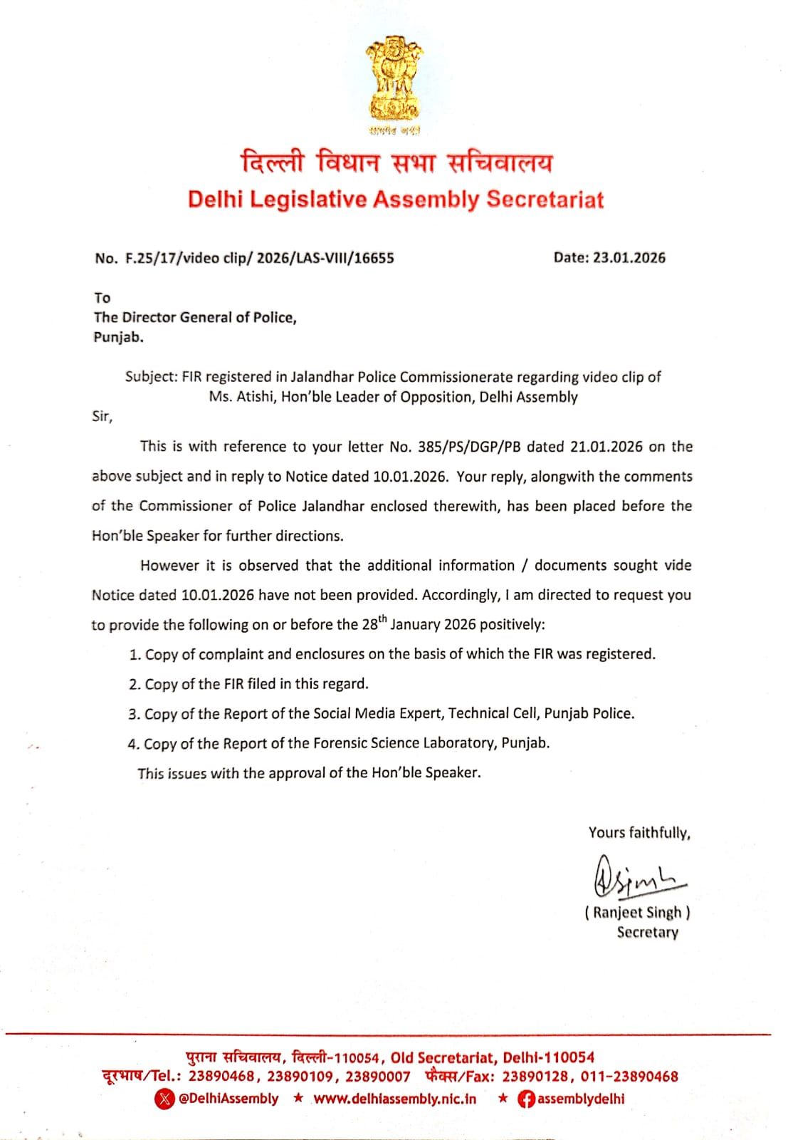 विधानसभा सचिवालय की ओर से जारी पत्र में कहा गया है कि जालंधर पुलिस कमिश्नरेट में दर्ज एफआईआर के संबंध में पहले भी जानकारी मांगी गई थी, लेकिन मांगी गई अतिरिक्त सूचनाएं उपलब्ध नहीं कराई गईं। ऐसे में डीजीपी, पंजाब को निर्देश दिया गया है कि 28 जनवरी 2026 तक अनिवार्य रूप से संबंधित दस्तावेज उपलब्ध कराए जाएं।