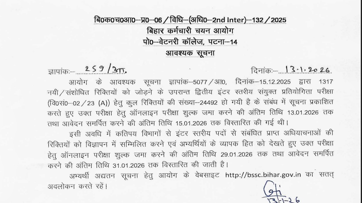 जॉब डेस्क, नई दिल्ली। बिहार कर्मचारी चयन आयोग की ओर से इंटर लेवल भर्ती परीक्षा में आवेदन करने की अंतिम तिथि को एक्सटेंड कर दिया गया है। जो उम्मीदवार इंटर लेवल भर्ती परीक्षा के लिए ऑनलाइन माध्यम से आवेदन नहीं कर सके थे। उन उम्मीदवारों को आवेदन करने का दोबारा मौका दिया गया है। बीएसएससी की आधिकारिक अधिसूचना के मुताबिक अब इच्छुक एंव योग्य उम्मीदवार इन पदों के लिए 29 जनवरी तक अप्लाई कर सकते हैं। ऐसे में सभी उम्मीदवारों को सलाह दी जाती है कि वे इस बार आवेदन प्रक्रिया को अवश्य पूरा कर लें।