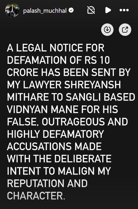 पलाश ने इंस्टाग्राम स्टोरी पर किए गए एक पोस्ट के जरिए कहा, “मेरे वकील श्रेयांश मिथारे ने सांगली के विज्ञान माने को मेरी प्रतिष्ठा और चरित्र को खराब करने के जानबूझकर इरादे से लगाए गए झूठे, अपमानजनक और अत्यधिक मानहानिकारक आरोपों के लिए 10 करोड़ रुपये का कानूनी नोटिस भेजा है।“