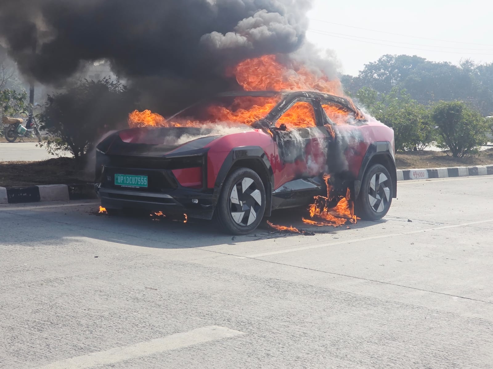 कुराना टोल प्लाजा के पास इलेक्ट्रिक कार में आग लगने के बाद उठती लपटें। फोटो- जागरण