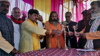 बिहपुर प्रखंड के सोनवर्षा पंचायत में महाविष्णु यज्ञ के वार्षिकोत्सव आयोजित कार्यक्रम का शुभारंभ करते स्वामी आगमानंद जी महाराज व अन्य।