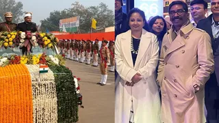 दुमका में ध्वजारोहण के बाद परेड की सलामी लेते उपायुक्त अभिजीत सिन्हा और मुख्यमंत्री हेमंत सोरेन व उनकी पत्नी कल्पना सोरेन (फाइल फोटो)।