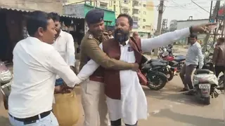 चिरकुंडा नगर परिषद कार्यालय के सामने आत्मदाह का प्रयास करते राजेश मिश्रा और रोकती पुलिस।