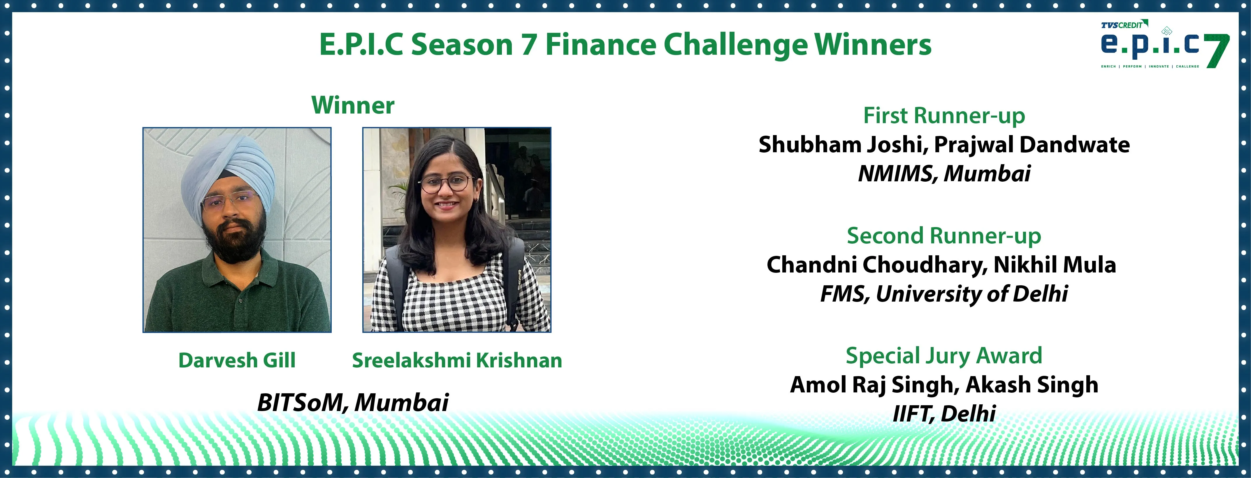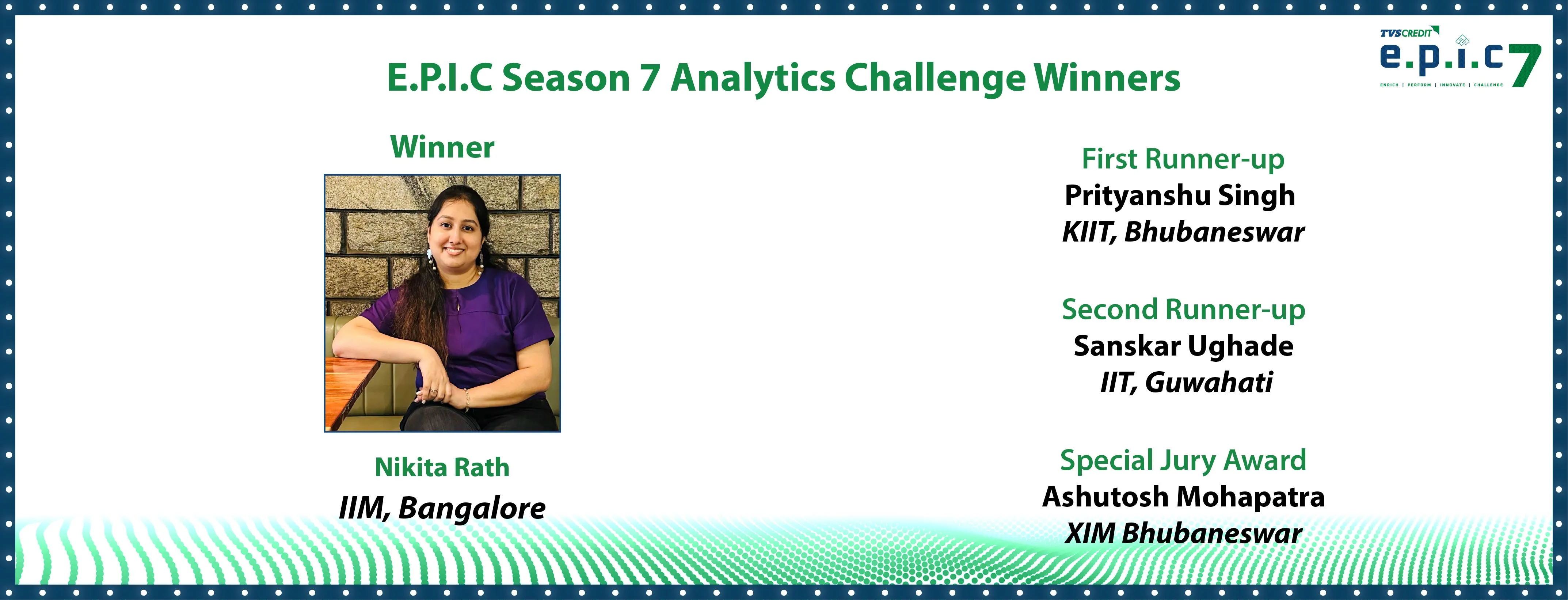 All winners were rewarded with cash prizes worth Rs 10,00,000 lakh (1,00,000 for 1st place, Rs 75,000 for 2nd place, Rs 50,000 for 3rd place and Rs 25,000 for special jury mention), along with pre-placement interview opportunities at TVS Credit and exclusive E.P.I.C 7 merchandise.