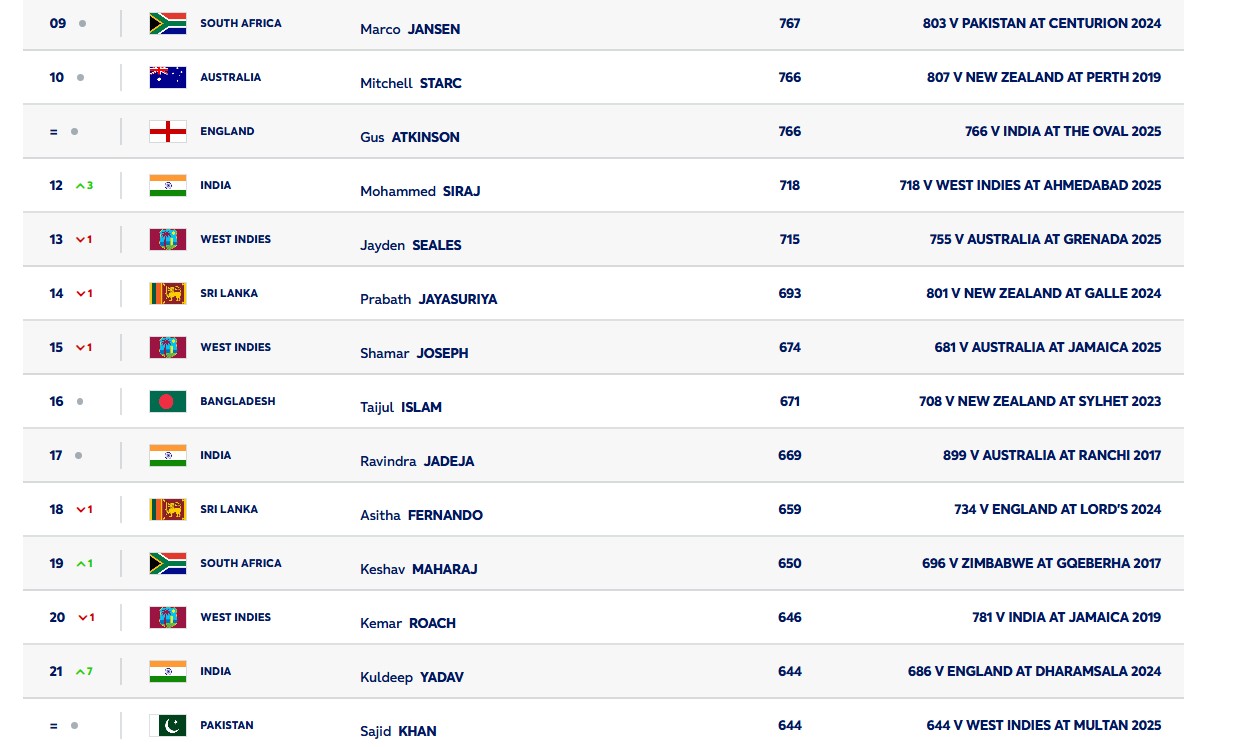 दरअसल, मोहम्मद सिराज (Mohammed Siraj) ने आईसीसी बॉलर्स टेस्ट रैंकिंग (ICC Test Bowlers Rankings) में तीन पायदान ऊपर चढ़कर 12वां स्थान हासिल किया। उन्होंने अपने करियर की बेस्ट रेटिंग हासिल की है। उनके खाते में फिलहाल 718 रेटिंग अंक है।