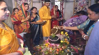 धनबाद के हिल कॉलोनी शिव मंदिर में शिवरात्रि कूी पूजा करते भक्तगण।