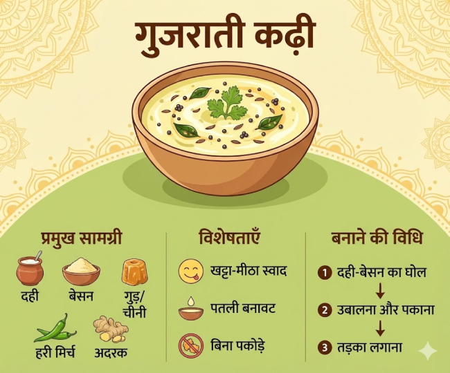 - सामग्री: दही, बेसन, अदरक-हरी मिर्च का पेस्ट, चीनी/गुड़, पानी, नमक।