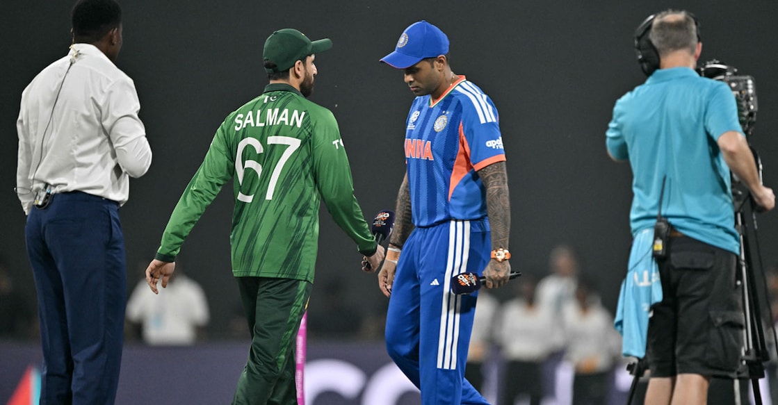 കൊളംബോ∙ ട്വന്റി20 ലോകകപ്പിലെ ഇന്ത്യ– പാക്കിസ്ഥാൻ മത്സരത്തിന്റെ ടോസ് സമയത്ത് മുഖത്തേക്കു പോലും നോക്കാതെ ഇരു ടീമുകളുടേയും ക്യാപ്റ്റൻമാർ. ഇന്ത്യൻ ക്യാപ്റ്റൻ സൂര്യകുമാർ യാദവും പാക്ക് ക്യാപ്റ്റൻ സൽമാൻ അലി ആഗയും തമ്മിൽ ഹസ്തദാനവും ഉണ്ടായില്ല. വാർത്താസമ്മേളനത്തിൽ ഹസ്തദാനത്തെക്കുറിച്ച് ചോദ്യം ഉയർന്നപ്പോൾ കുറച്ചുനേരംകൂടി കാത്തിരിക്കാനായിരുന്നു ഇന്ത്യൻ ക്യാപ്റ്റന്റെ മറുപടി.