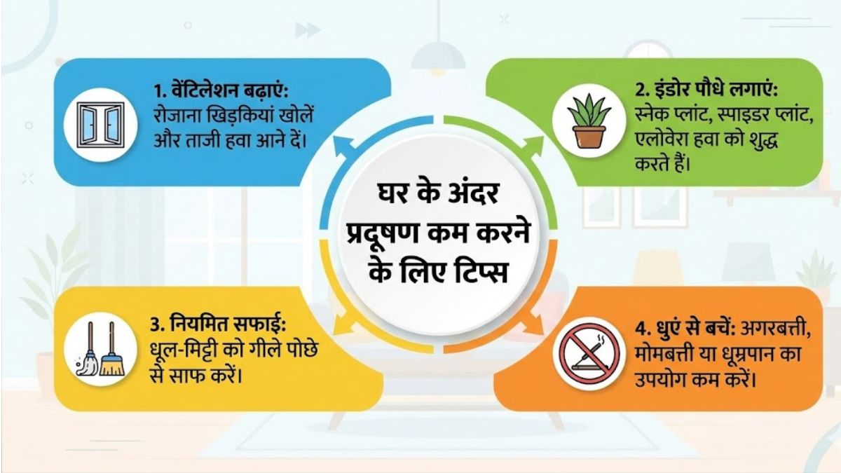 • इंडोर प्लांट्स लगाएं- ऐसे पौधे जैसे स्नेक प्लांट, एलोवेरा, मनी प्लांट, तुलसी आदि न सिर्फ हवा को शुद्ध करते हैं, बल्कि घर की हवा में ताजगी भरते हैं।