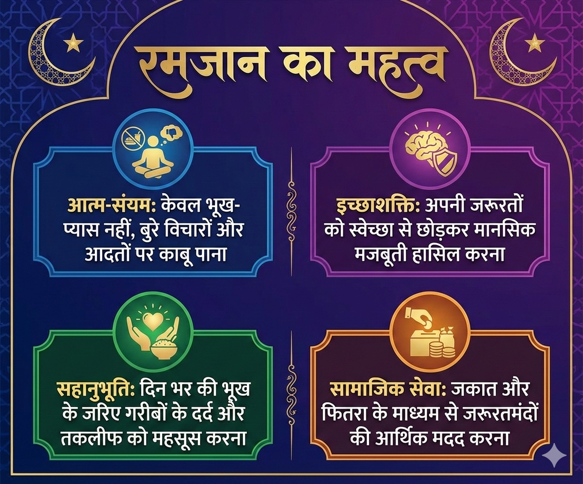 - मानसिक अनुशासन (Mental Descipline): रोजा केवल पेट का नहीं, बल्कि आंखों, जुबान और विचारों का भी होता है, जो इंसान को एक अनुशासित जीवन की ओर ले जाता है।