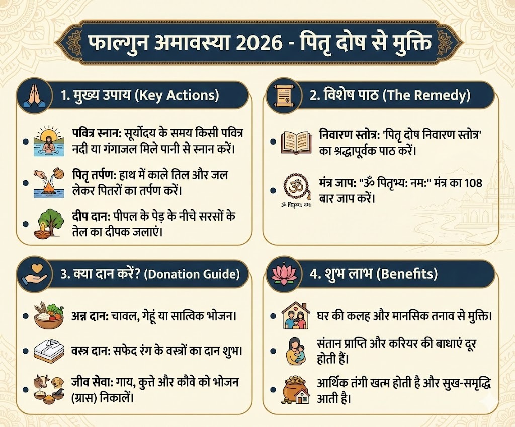 पितृ दोष के कारण अक्सर परिवार में कलह, संतान प्राप्ति में बाधा या आर्थिक तंगी बनी रहती है। धार्मिक मान्यताओं और ज्योतिष शास्त्र के अनुसार, फाल्गुन अमावस्या पर किए गए कुछ विशेष कार्य इन समस्याओं को जड़ से खत्म कर सकते हैं।