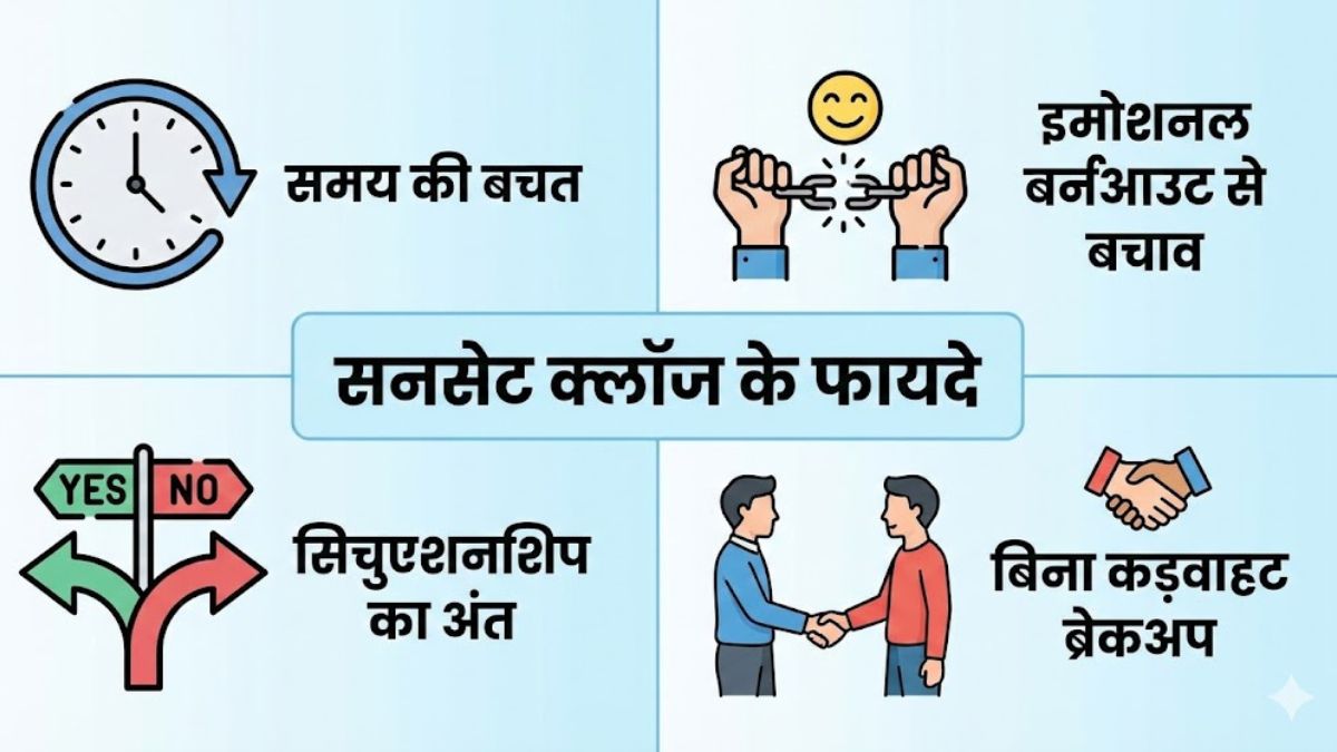 - समय की बचत- अक्सर लोग महीनों या सालों तक ऐसे रिश्तों में फंसे रहते हैं जिनका कोई भविष्य नहीं होता। सनसेट क्लॉज युवाओं को उस अनिश्चितता से बचाता है। उन्हें पता होता है कि एक तय समय के बाद उन्हें फैसला लेना है, जिससे समय की बर्बादी नहीं होती।