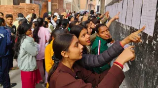 परीक्षा केंद्र के बाहर रोल नंबर तलाशते परीक्षार्थी।