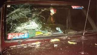ग्रामीणों के हमले में पुलिस का क्षतिग्रस्त वाहन।