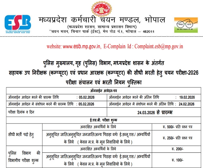 जॉब डेस्क, नई दिल्ली। मध्य प्रदेश में सहायक उप निरीक्षक एवं हेड कॉन्स्टेबल (Computer) के रिक्त पदों पर भर्ती चल रही है जिसमें शामिल होने के लिए फॉर्म भरने की लास्ट डेट कल यानी 19 फरवरी निर्धारित है। ऐसे में जो भी युवा इस भर्ती के लिए पात्रता पूरी करते हैं और अभी तक किसी कारणवश फॉर्म नहीं भर सके हैं वे बिना देरी करते हुए एमपीईएसबी की ऑफिशियल वेबसाइट esb.mp.gov.in पर जाकर आवेदन प्रक्रिया पूर्ण कर सकते हैं। कल के बाद एप्लीकेशन विंडो क्लोज कर दी जाएगी।
