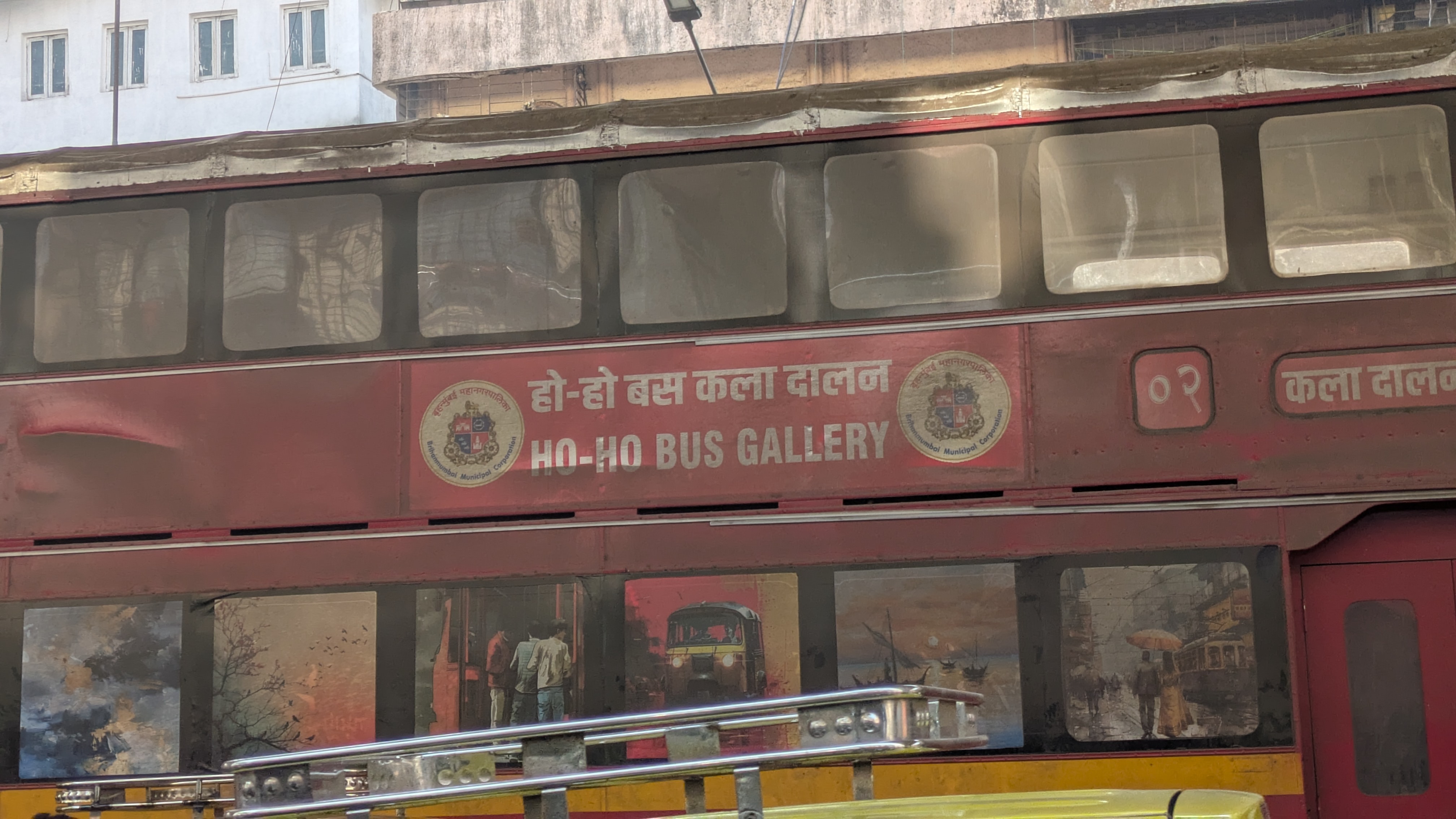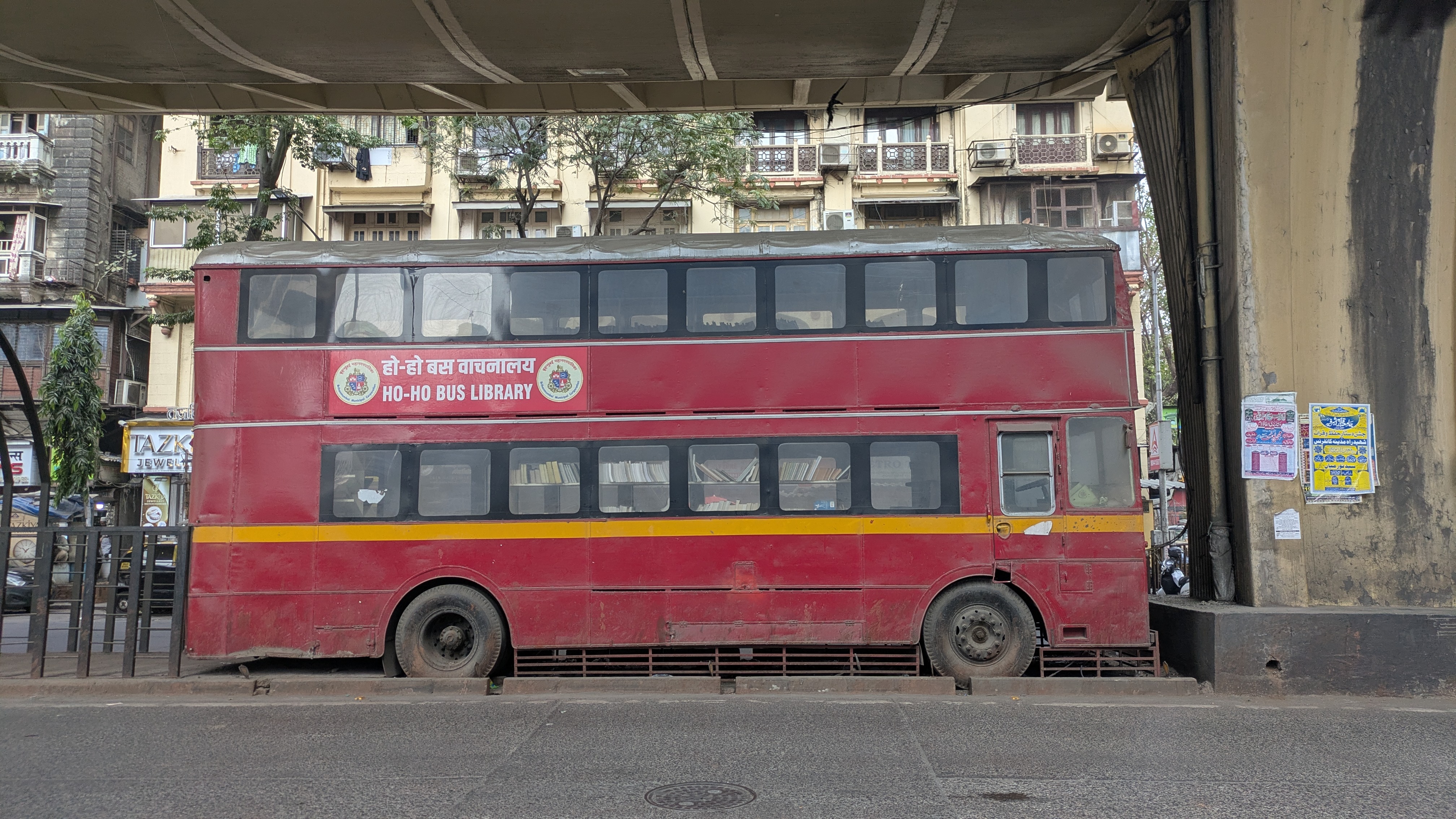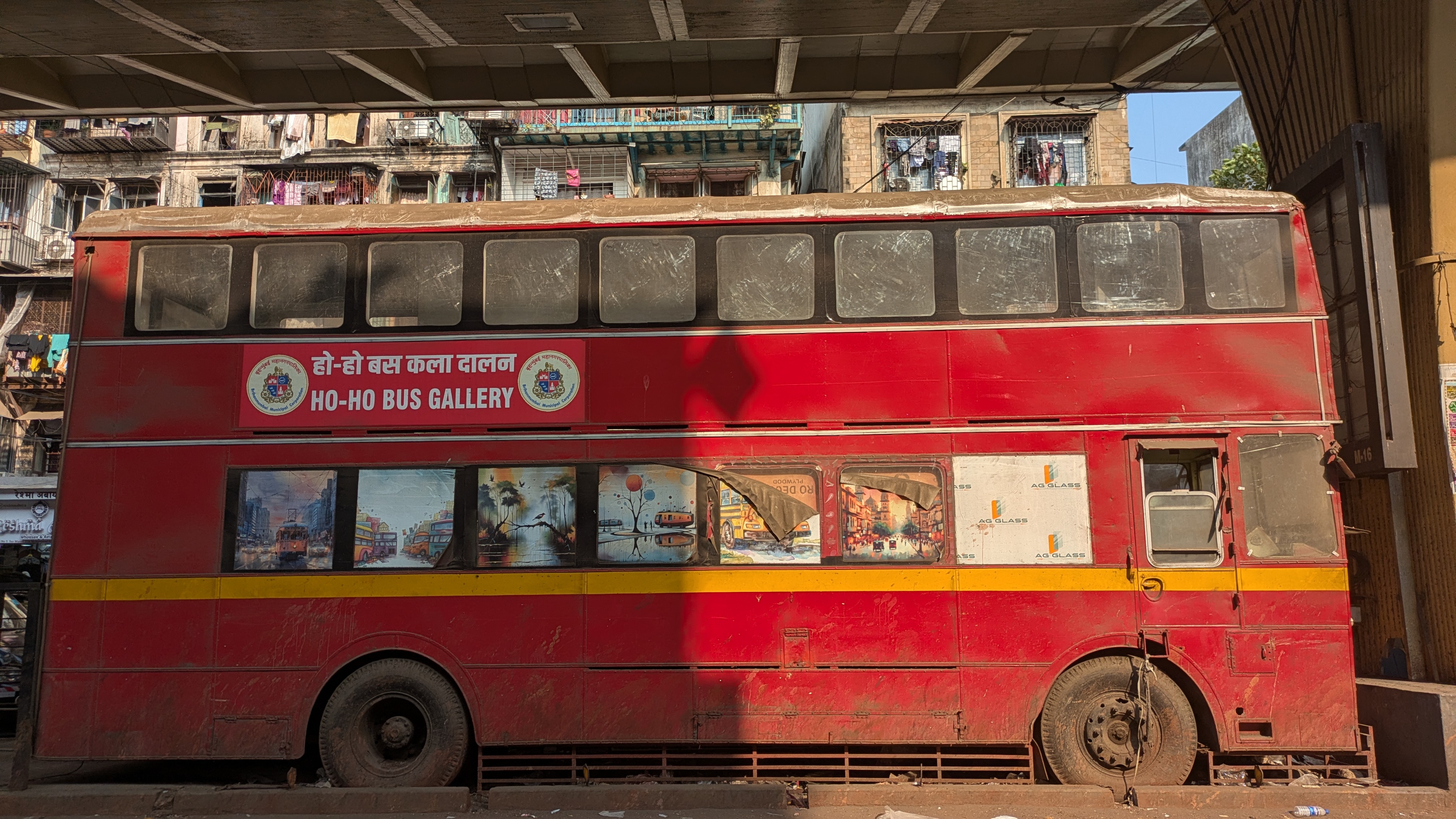 ये तीन पुरानी डबल डेकर बसें जेजे फ्लाईओवर के नीचे खड़ी हैं। पहली बस साउथ मुंबई की तरफ से आते हुए पायधोनी जंक्शन पर \“कैफेटेरिया\“ के नाम से खड़ी है। दूसरी बस मिनारा मस्जिद के पास \“लाइब्रेरी\“ के रूप में और तीसरी बस जेजे जंक्शन के पास \“आर्ट गैलरी\“ के रूप में रखी गई है। ये बसें मारोल डिपो की थीं और 15 साल की सेवा पूरी करने के बाद इन्हें सार्वजनिक सेवा से हटा दिया गया था।