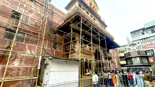 ठाकुर बांकेबिहारी मंदिर के बाहर पत्थरों की सफाई के लिए लगाई गई पाड़।