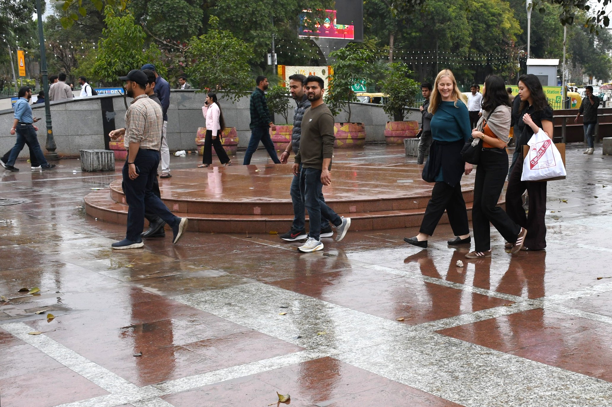 हत्की वर्षा से साफ हुई राजधानी की हवा में कनाट प्लेस में घूमते लोग। हरीश कुमार