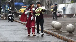 सुहावने मौसम में कनाट प्लेस स्थित पालिका बाजार के पास अपने नन्हे को लिए दंपति। हरीश कुमार