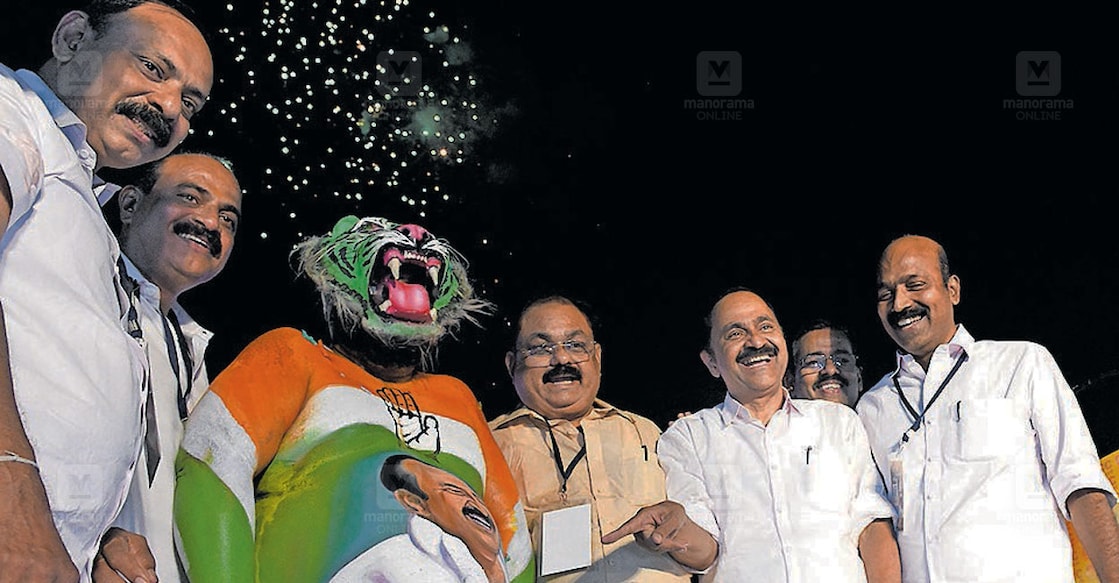 ത്രിവർണ അലങ്കാരങ്ങളും കാവടിയും ബലൂണുകളും പതാകകളുമായി പ്രവർത്തകരും നേതാക്കളും സ്വരാജ് റൗണ്ടിലെ യാത്ര ആഘോഷമാക്കി. കെപിസിസി പ്രസിഡന്റ് സണ്ണി ജോസഫ്, എഐസിസി സെക്രട്ടറി കെ.സി. വേണുഗോപാൽ എംപി, ഡിസിസി പ്രസിഡന്റ് ജോസഫ് ടാജറ്റ്, വി.ഡി. സതീശൻ എന്നിവരുടെ മുഖങ്ങൾ വയറിൽ വരച്ചെത്തിയ പുലിക്കളി വേഷം ധരിച്ച കലാകാരന്മാരും ആകർഷകമായി. ബാൻഡ് മേളം, നാസിക് ധോൽ തുടങ്ങിയ വാദ്യമേളങ്ങളുടെ അകമ്പടിയുമുണ്ടായിരുന്നു. മണികണ്ഠനാൽ പരിസരത്തെ സമ്മേളന വേദിയിലേക്ക് പ്രവർത്തകർ വി.ഡി. സതീശനെ തോളിലേറ്റിയാണ് എത്തിച്ചത്. വേദിയിൽ ഒരുക്കിയിരുന്ന പറയിൽ നെല്ല് നിറച്ച ശേഷമാണ് സമ്മേളനം ആരംഭിച്ചത്. പ്രസംഗ ശേഷം ബാലമഞ്ചിലെ കുട്ടികൾ സതീശനു റോസാപ്പൂക്കളും നൽകി. English Summary: