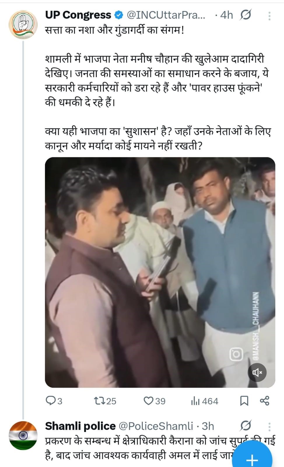 बुधवार रात यूपी कांग्रेस के एक्स पेज से वीडियो को प्रसारित करते भाजपा सरकार पर निशाना साधा गया। इस संबंध में शामली पुलिस ने संज्ञान लिया। एसपी ने प्रकरण की जांच सीओ कैराना को सौंपी है, और तीन दिन में रिपोर्ट मांगी है। वहीं, गुरुवार को भाजपा नेता का एक और वीडियो प्रसारित हुआ, जिसमें वह अधीक्षण अभियंता से फोन पर बात करते हुए सभी बिजली घर बंद कराने की चेतावनी दे रहे हैं।