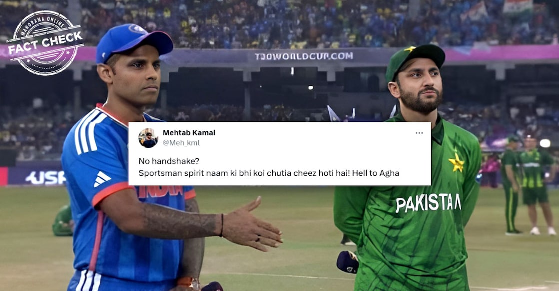 ടി20 ലോകകപ്പ് മത്സരത്തിൽ ഇന്ത്യ പാക്കിസ്ഥാനെ പരാജയപ്പെടുത്തിയതിന് ശേഷം, സമൂഹമാധ്യമങ്ങളിൽ ഒരു ചിത്രം വ്യാപകമായി പ്രചരിക്കുന്നുണ്ട്. ഹസ്തദാനത്തിനായി സൂര്യകുമാർ യാദവ് കൈ നീട്ടിയപ്പോൾ അത് വകവയ്ക്കാതെ നിൽക്കുന്ന സൽമാൻ ആഗയാണ് വൈറൽ ചിത്രത്തിലുള്ളത്. ഇന്ത്യയെ പരിഹസിക്കുന്ന തരത്തിൽ നിരവധി പാക്കിസ്ഥാൻ അനുകൂല സോഷ്യൽ മീഡിയ അക്കൗണ്ടുകൾ ചിത്രം വ്യാപകമായി പ്രചരിപ്പിക്കുന്നുണ്ട്. എന്നാൽ പ്രചാരണം തെറ്റിദ്ധരിപ്പിക്കുന്നതാണെന്ന് അന്വേഷണത്തിൽ വ്യക്തമായി.വാസ്തവമറിയാം.