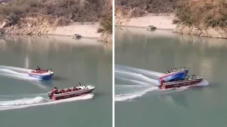 धारी देवी मंदिर परिसर के नीचे अलकनंदा झील में एक दूसरे के ऊपर चढ़ी बोट का वीडियो हो रहा है वायरल।